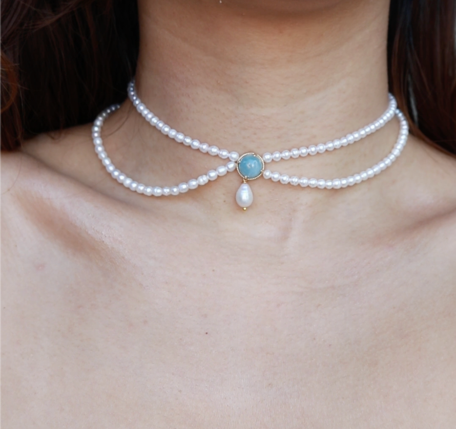 Add a touch of magic to your wardrobe with our Renaissance-Inspired Double Strand Baby Pearl Necklace! This enchanting piece features two strands of lustrous baby pearls, paired perfectly with a dreamy aquamarine charm right in the middle.