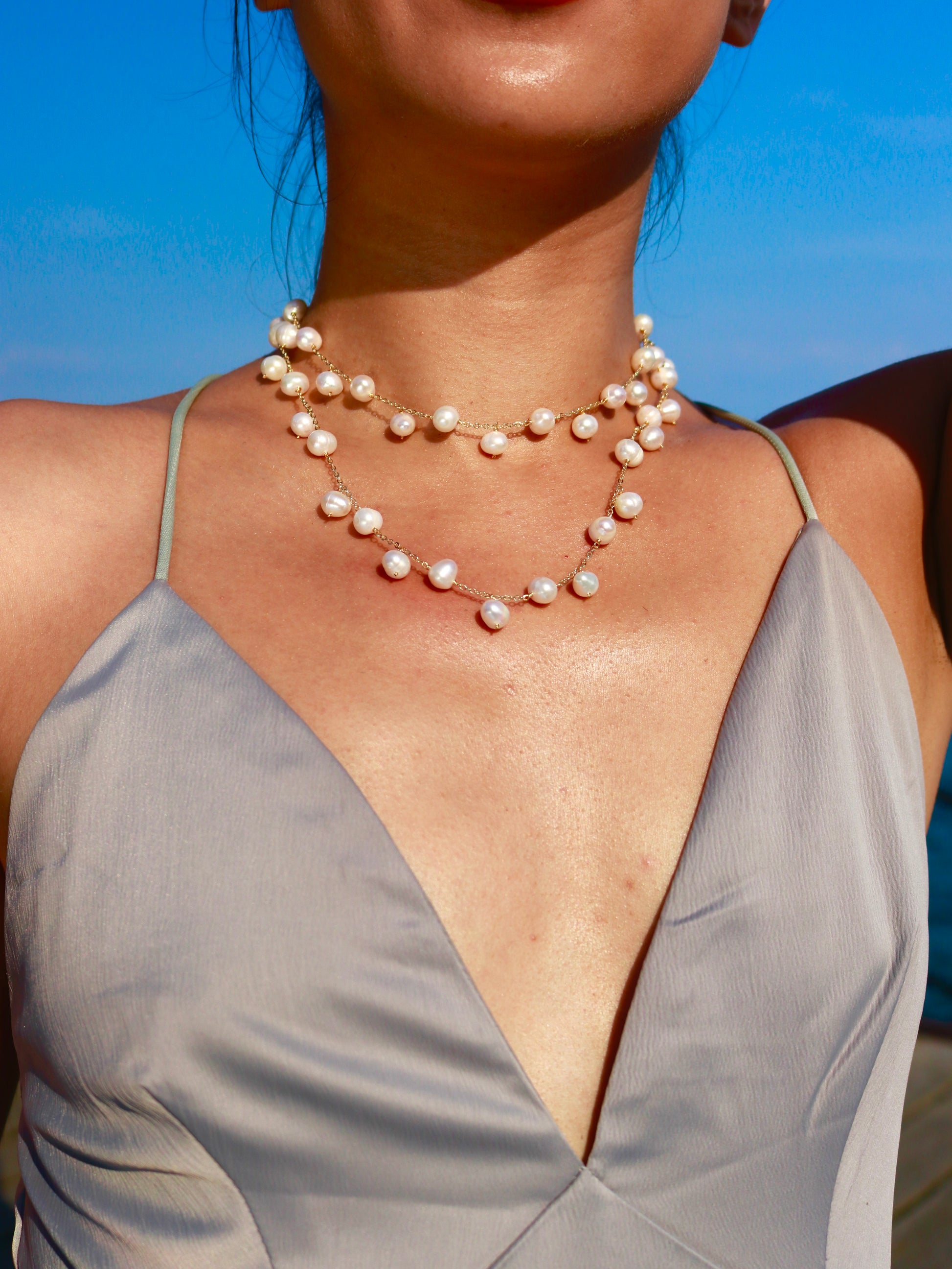 Natural Freshwater Pearls: Created using baroque pearls that blend harmoniously with a 14K gold-filled chain.