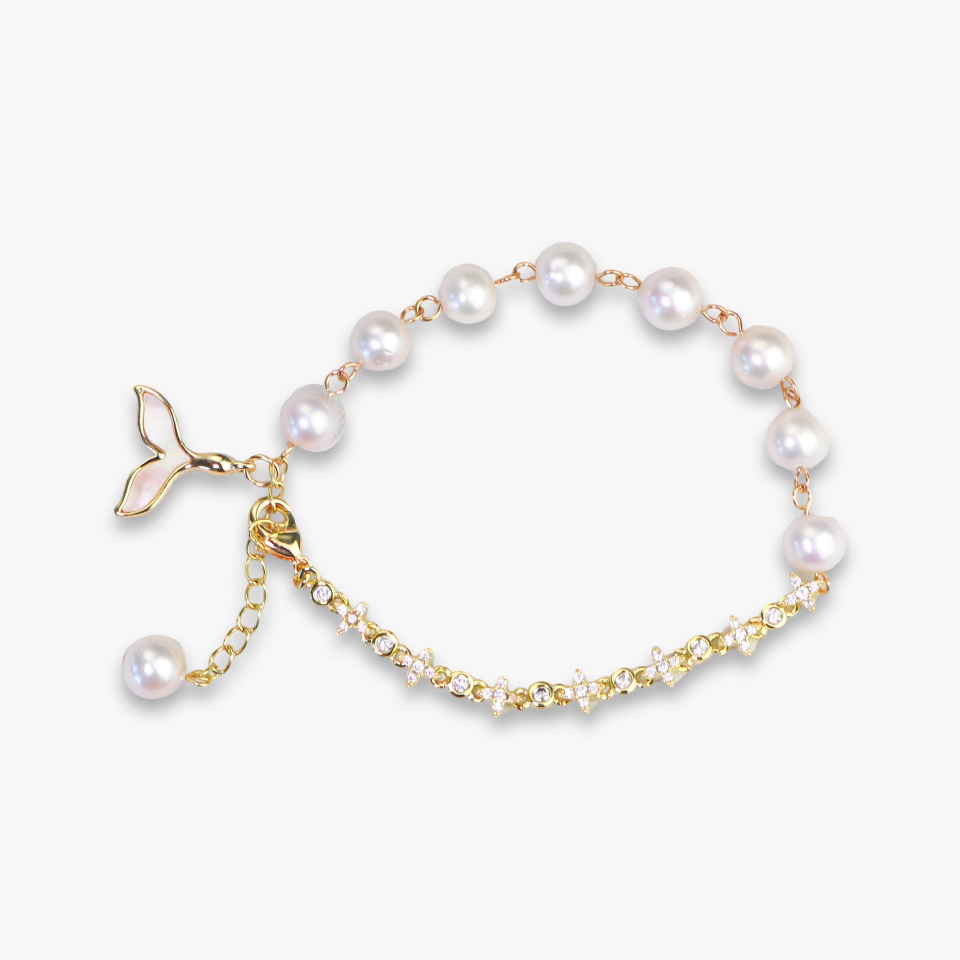 You've just arrived from under the sea with this mermaid-worthy bracelet! Crafted with half pearls and half gold, inlaid with sparkling cubic zirconia, plus a tail charm made from mother of pearl shell- it's super cute, dainty, and versatile.