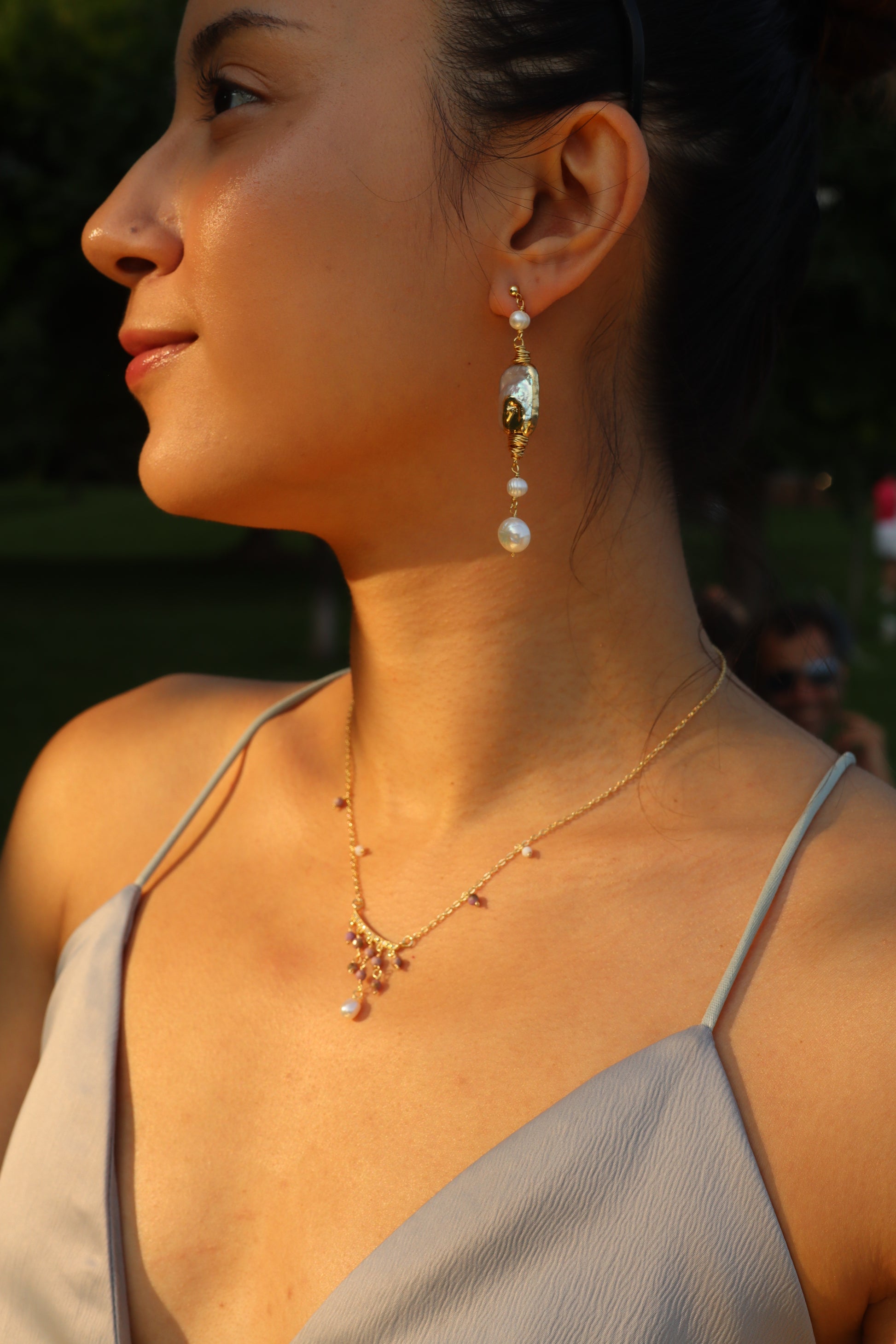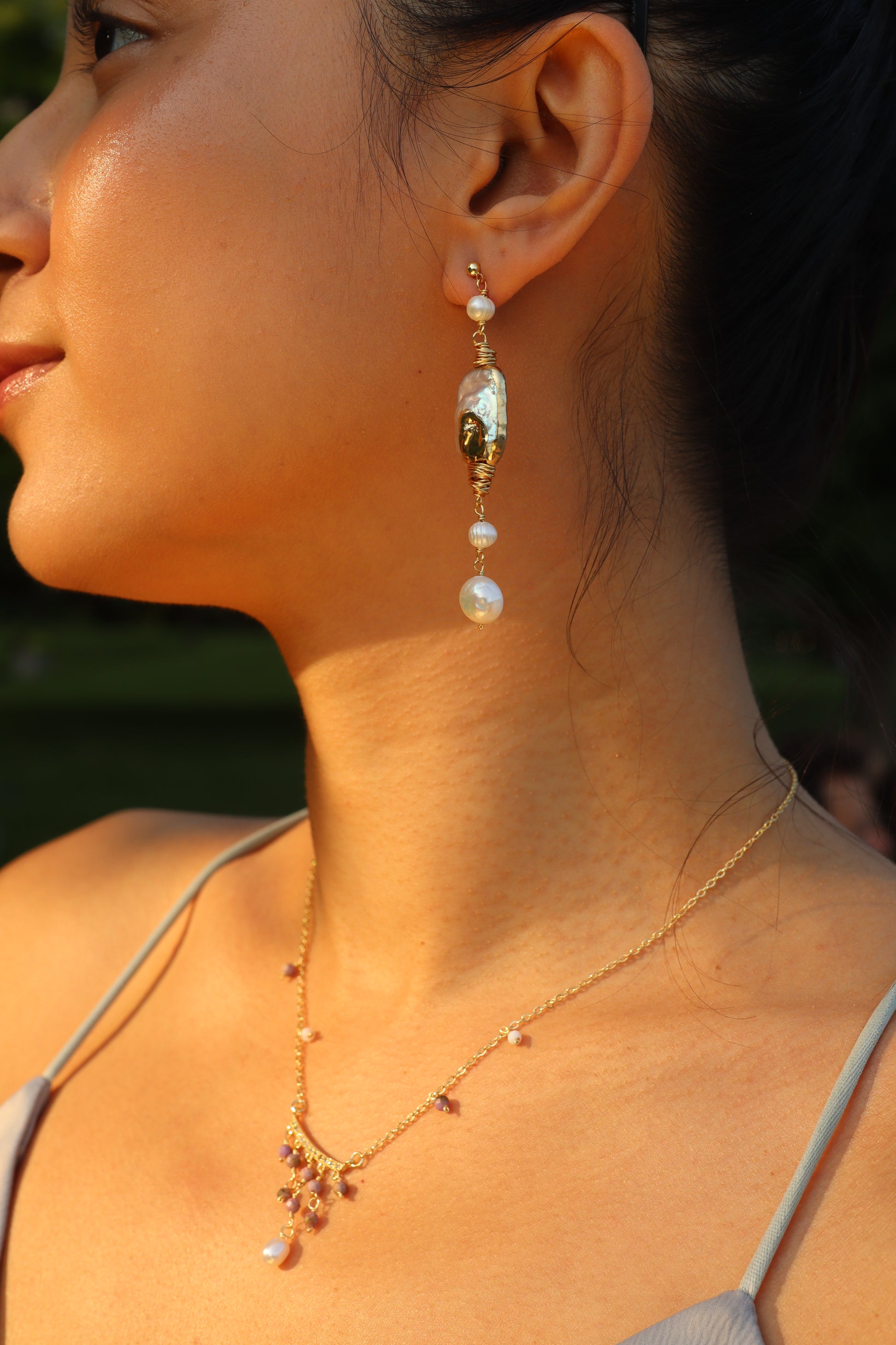 Illuminate your style with the Solara Earrings, a bold and beautiful statement piece that embodies bohemian charm. Featuring three near-round pearls and a large rectangular baroque pearl, these earrings are designed to make a striking impact with their unique and luxurious design.