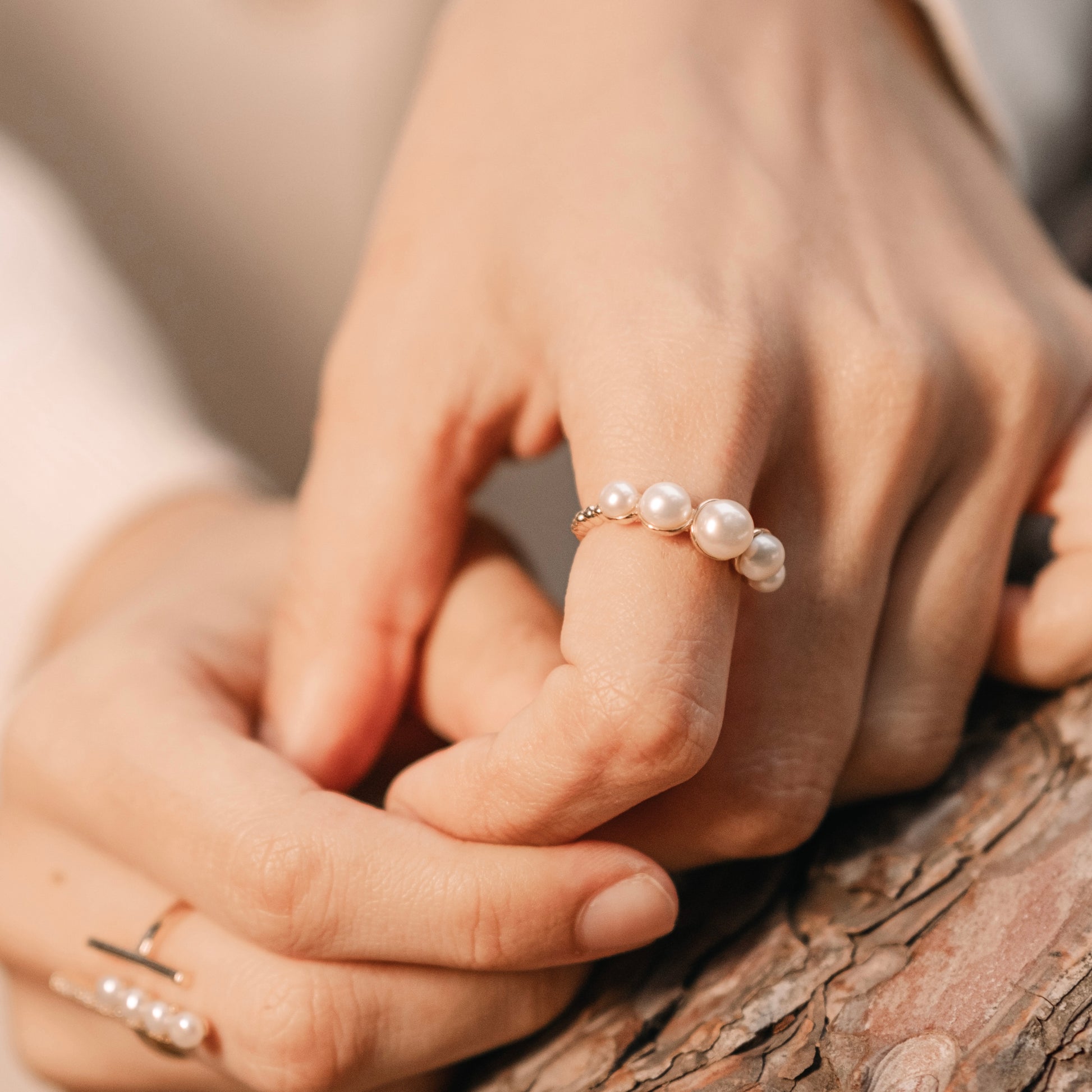 Wrap yourself in subtle elegance with our Symphony Ring. Displaying a gracefully arranged row of five pearls, this chic and unique piece is versatile. Stack it for a timeless look that will have you radiating confidence.