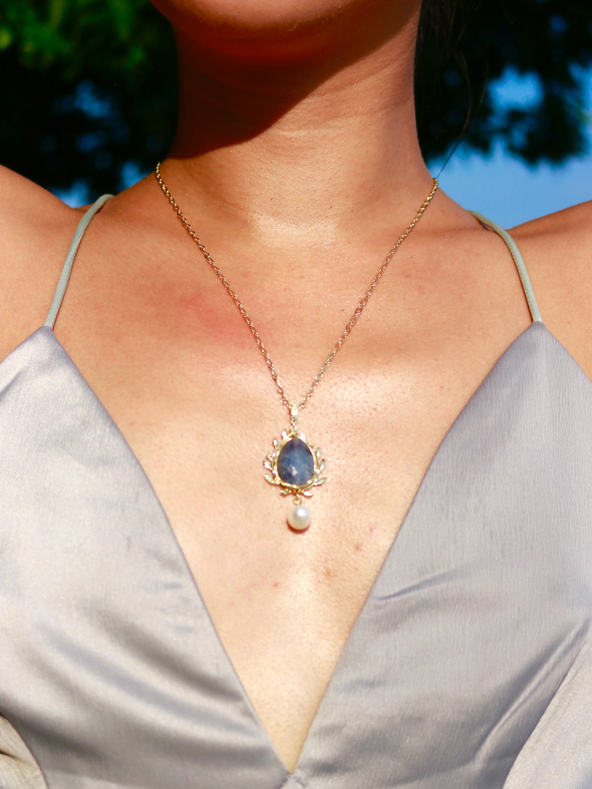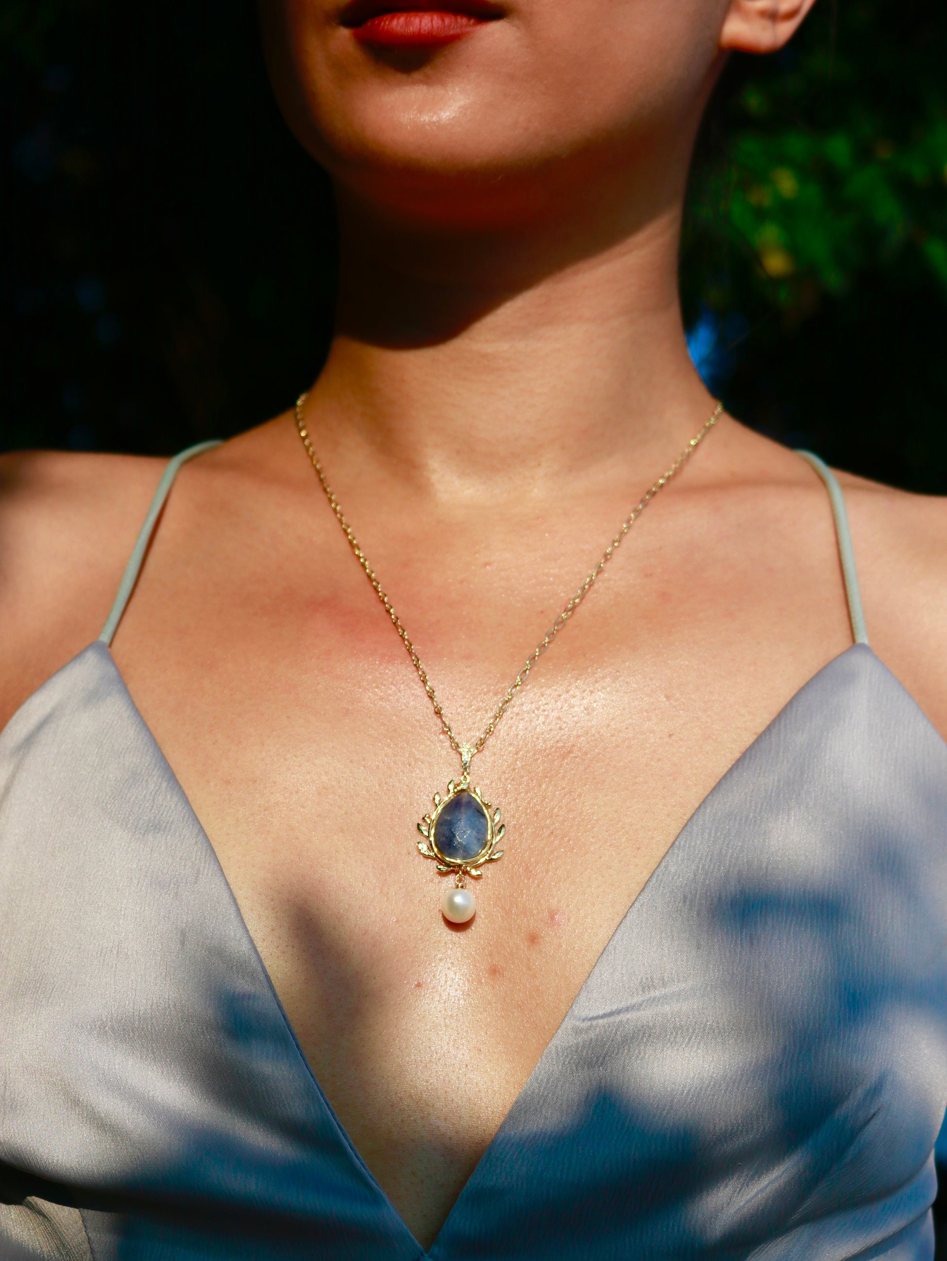 Dive into the beauty of the Thalassa Necklace, a captivating piece featuring a color-enhanced blue quartz pendant and a delicate freshwater pearl. Set in 14K gold-filled material, this necklace captures the serene essence of the ocean.